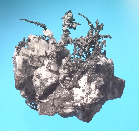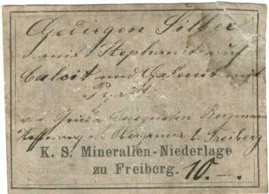 Silberlocken mit Calcit-xx auf Bleiglanz Obergruna bei Freiberg/Sa., Stufenbreite ca. 6 cm, mit altem Etikett der Mineralienniederlage Freiberg, um 1875 | |