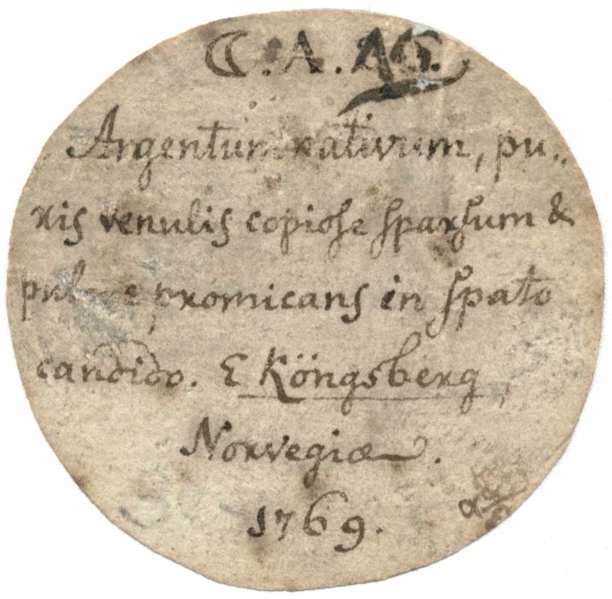 Silber-xx mit Calcit-Rhomboedern aus Kongsberg in Norwegen Die Stufe ist ca. 5 cm breit und ist nachweislich das geschichtlich älteste Stück in unserer Sammlung, wie das dazugehörige Etikett von 1769 zeigt. Das Stüfchen stammt ursprünglich aus der Sammlung des Braunschweiger Arztes Franz Ernst Brückmann, der von 1697 bis 1753 lebte. | |