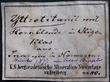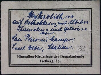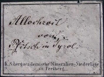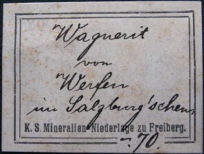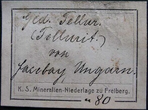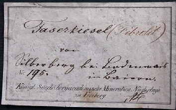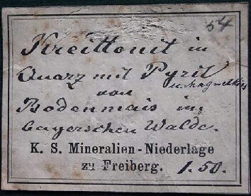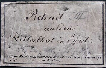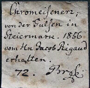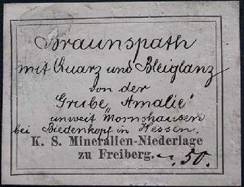 Größe 41 x 40 mm Originalhandschrift des berühmten Mineralogen Friedrich August Breithaupt (1781-1873), welcher von 1826 bis 1866 an der Bergakademie Freiberg lehrte. Beschriftet wurde das Etikett 1856 | ||||||||||||||||||||||||||||||||||||||||||||||||||||||||||||||||||||||||||||||||||||||||||||