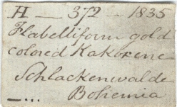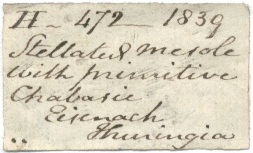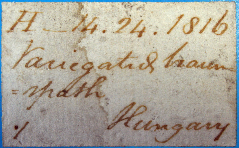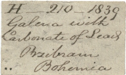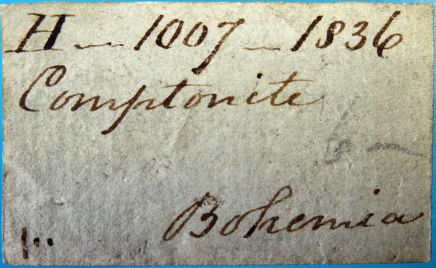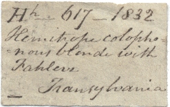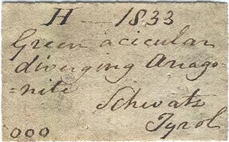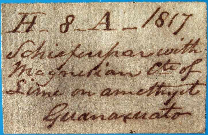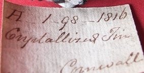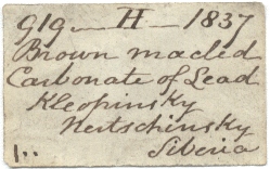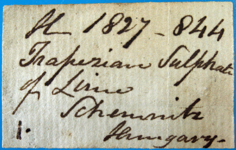 John Henry Heuland wurde 1778 als Johannes Heinrich Heuland in meiner Oberfränkischen Heimat, in Bayreuth geboren. Gestorben ist er am 16. November 1856 in Hastings/Sussex, England. Er war einer der bedeutendsten Mineraliensammler und Händler in England. Er verbrachte einige Jahre in Moskau, St. Petersburg, Paris, sowie Spanien und Portugal. Ausgedehnte Einkaufsreisen führten ihn durch ganz Europa bis nach Skandinavien und Rußland. Er war Mitglied der Geologischen Soc. London und hatte bereits damals beste Handelsbeziehungen nach Nord- und Südamerika und nach Australien! 1806 erbte er die Sammlung von Jacob Forster, erweiterte diese und verkaufte sie 1820 an Charles H. Turner. Später baute er eine eigene große Sammlung auf und kaufte die Sammlung des Marquis de Dreé in Paris dazu. Stufen aus dieser Sammlung und wohl auch aus weiteren Sammlungen, wurden dann auf Auktionen, die von Heuland in London veranstaltet wurden, verkauft. Die entsprechenden Auktionskataloge befinden sich noch heute im Britischen Museum NH im Depot. Zu seinen Kunden zählten neben Museen in ganz Europa, vor allem Privatsammler von hohem Niveau, wie z.B. der Londoner Brauereibesitzer Isaac Walker (1793-1853). Ein Teil dieser Walker-Sammlung gelangte später über den Londoner Mineralienhändler Samuel Henson (1848-1930) an die Bonner Mineralienhandlung Krantz und somit wieder in den Mineralienhandel. 1822 wurde Heuland durch den Britischen Mineralogen H.J. Brooke geehrt, indem dieser ein Blätterzeolith nach ihm benannte: Heulandit. Die auf den Etiketten vermerkten Buchstaben geben Auskunft über die Vorbesitzer der Mineralien. So steht z. B. das "H" vermutlich für Stücke aus Heulands eigener Sammlung, das "F" für Stücke aus der Sammlung von Jacob Forster und das "C" für Stücke aus der Sammlung von Alexander Crichton. Es konnten bisher leider noch nicht alle Buchstaben zugeordnet werden. Bei den am unteren Rand befindlichen Punkten, Strichen und Ringen handelt es sich um einen Preiscode: O steht für eine Guinee (eine Goldmünze im Wert von 1 Pfund und 1 Schilling) I steht für ein Pfund - steht für einen Schilling . steht für einen Penny | ||||||||||||||||||||||||||||||||||||||||||||||||||||||||||||||||||||||||||||||||||||||||||||||||||