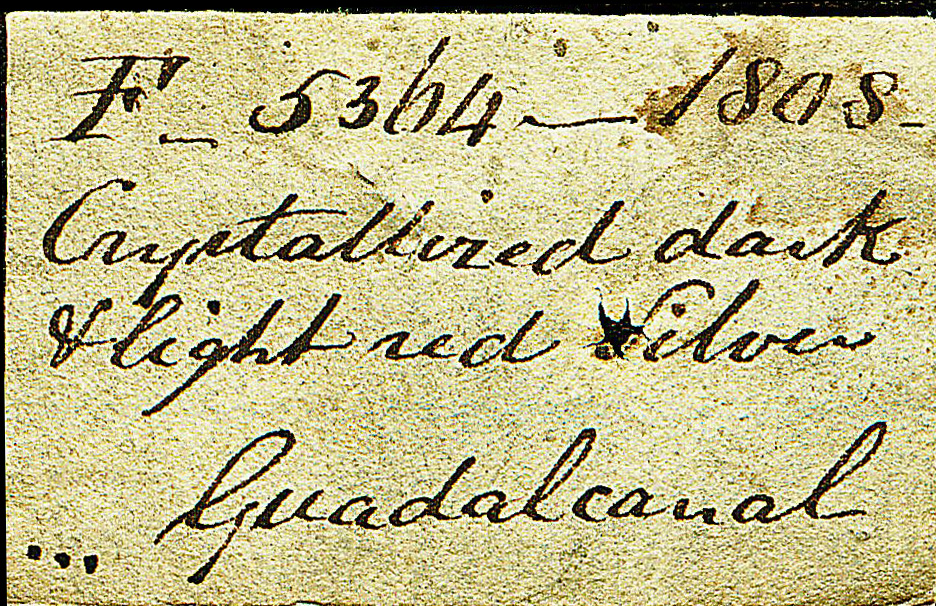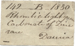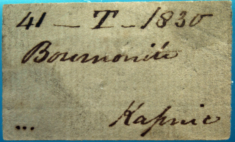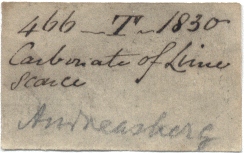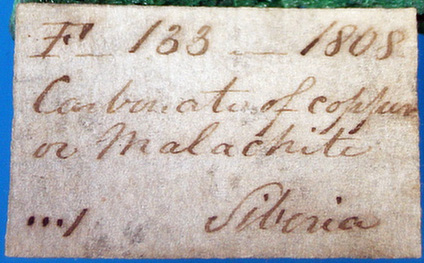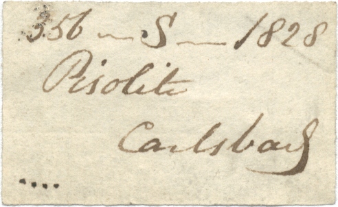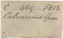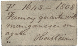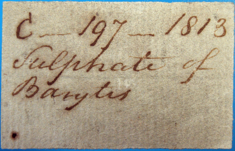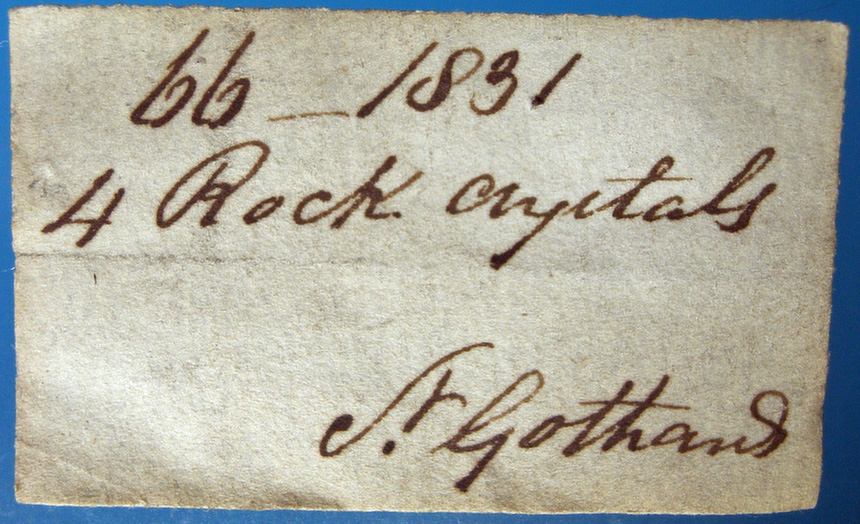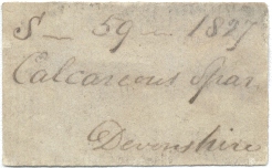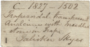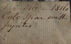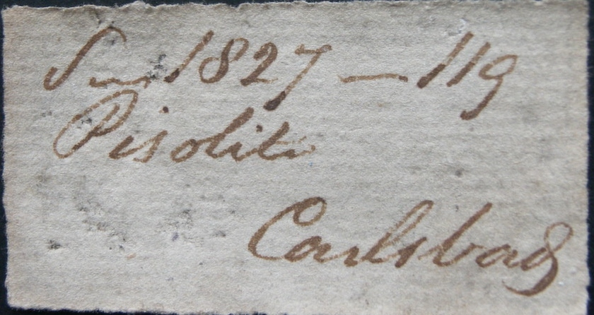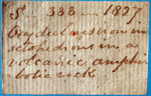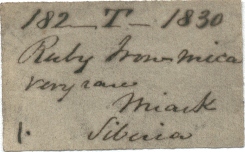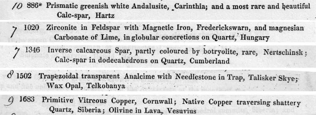 Die Nummern der rot markierten Etiketten mit der Jahreszahl 1827 finden sich wieder in einem Versteigerungskatalog von 1827 von Sowerby aus dem Natural Historie Museum London, in dem die Sammlung von Sir Alexander Crichton zur Versteigerung aufgelistet war. Die handschriftlichen Ziffern links geben die Preise in Schilling an. Damals waren 20 Schilling ein Pfund und 12 Penny ein Schilling. |