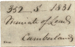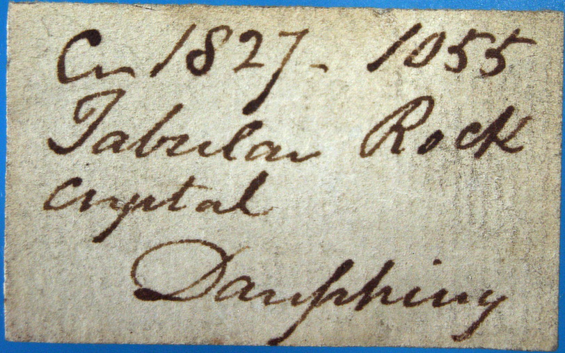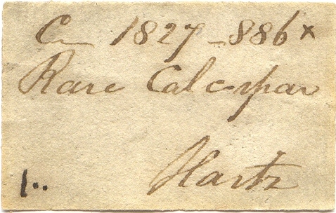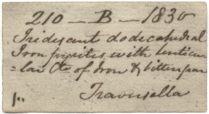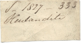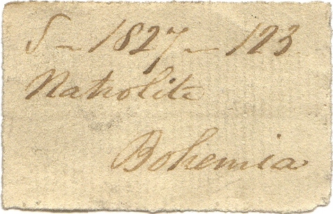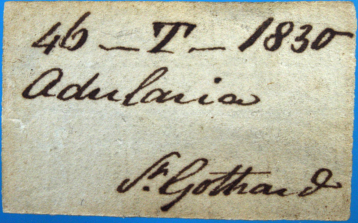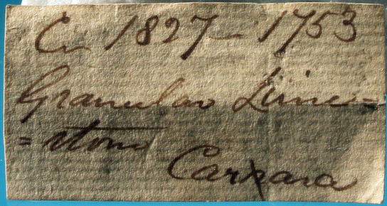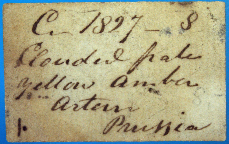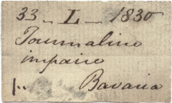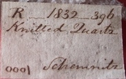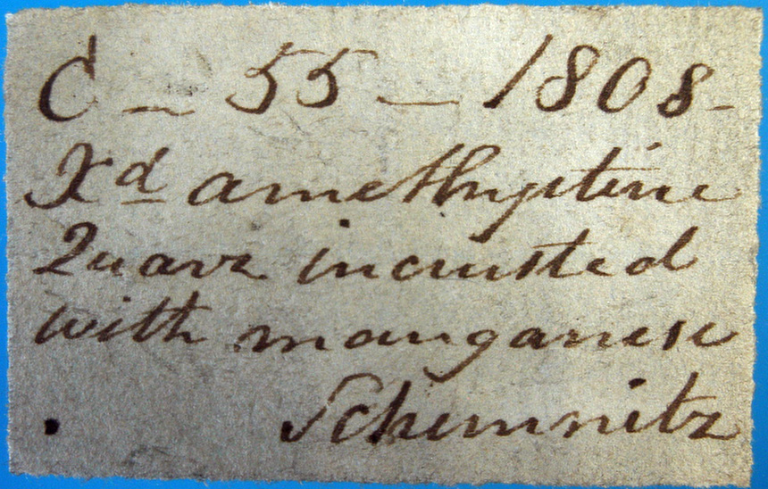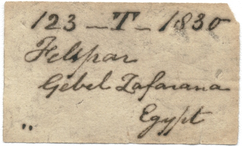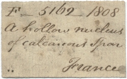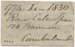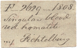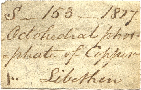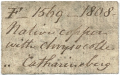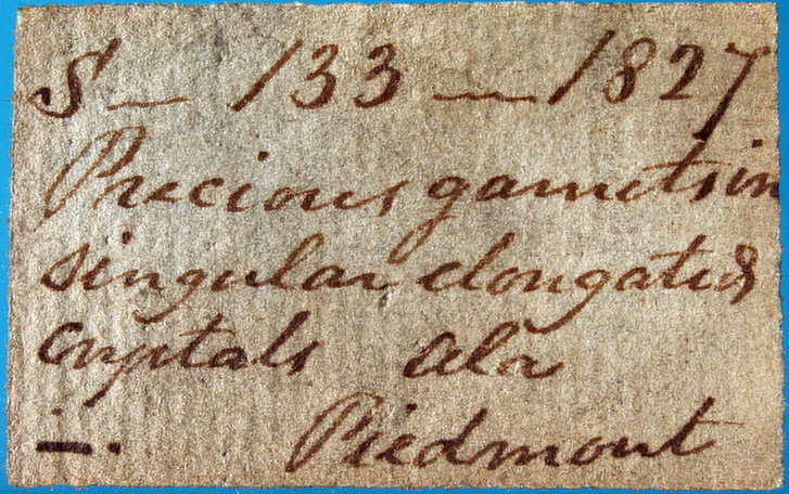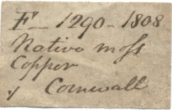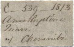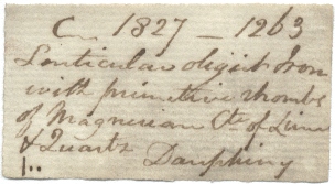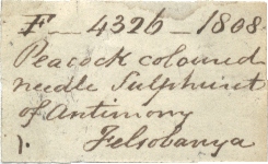 Die Nummern der rot markierten Etiketten mit der Jahreszahl 1827 finden sich wieder in einem Versteigerungskatalog von 1827 von Sowerby aus dem Natural Historie Museum London, in dem die Sammlung von Sir Alexander Crichton zur Versteigerung aufgelistet war. Die handschriftlichen Ziffern links geben die Preise in Schilling an. Damals waren 20 Schilling ein Pfund und 12 Penny ein Schilling. |