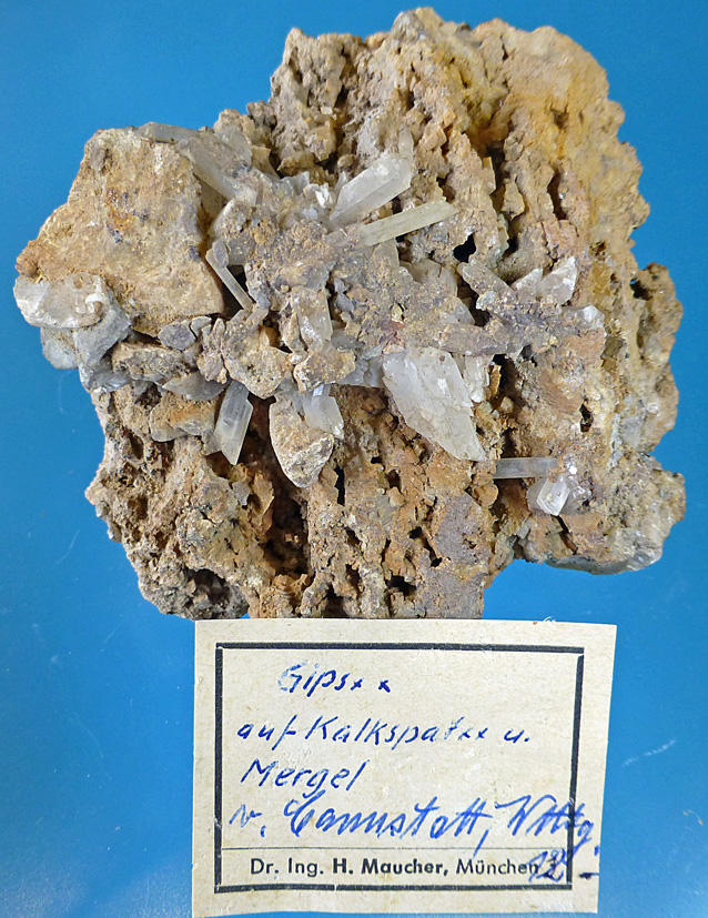 Bestell-Nr. 187 Gips-xx auf Kalkspat und Mergel Bad Cannstatt, Stuttgart Stufengröße ca. 8 x 8 x 4,5 cm Etikett Maucher Preis 17,- Euro | ||||||||||||||||||||||||||||||||||||||||||||||||||||||||||||||||||||||||||||||||||||||||||||||||||||||||