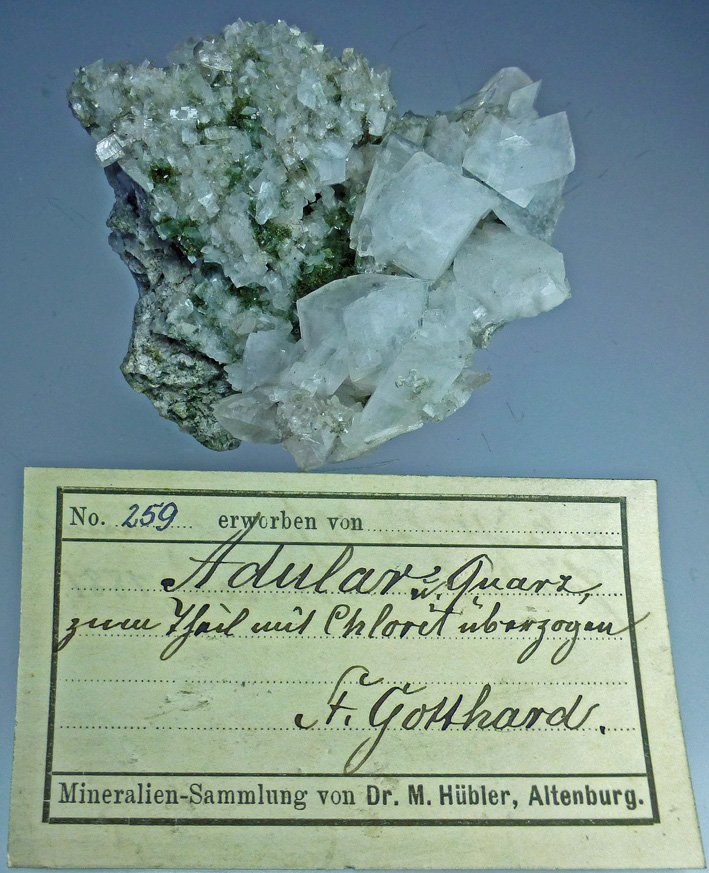 Bestell-Nr.: 201 Adular-xx und Quarz-xx zum Teil mit Chlorit überzogen Sankt Gotthard, Schweiz Größe der Stufe ca. 7 x 6,5 x 4,5 cm Etikett Hübler Preis 33,- | ||||||||||||||||||||||||||||||||||||||||||||||||||||||||||||||||||||||||||||||||||||||||||||||||||||||||