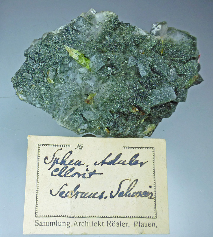 Bestell-Nr.: AE01 Sphen (Titanit) auf Adular mit Chlorit Sedruns, Schweiz Größe der Stufe ca. 8,5 x 4,5 x 5 cm Etikett Emil Rösler um 1910 Preis 29,- | ||||||||||||||||||||||||||||||||||||||||||||||||||||||||||||||||||||||||||||||||||||||||||||||||||||||||