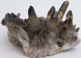 Rauchquarzkristalle mit Phantombildung. Die Stufe ist 17 cm breit und stammt aus einem Quarzgang im Steinbruch "Merkel", der an den Steinbruch Zufurt angrenzt. | |